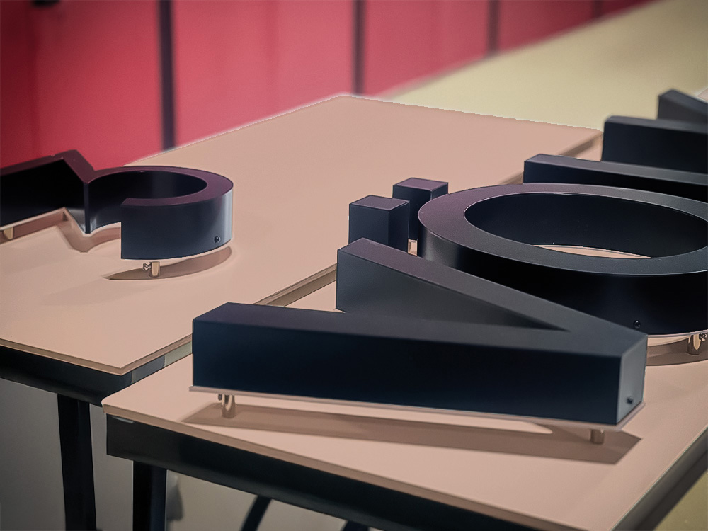 Zum Einsatz kam eine Materialkombination aus Aluminium und Acrylglas, die für eine langlebige, witterungsbeständige Ausführung im Außenbereich ausgelegt ist. Die Beleuchtung erfolgt über eine rückseitige LED-Ausleuchtung, die eine ruhige, gleichmäßige Lichtwirkung erzeugt und die Buchstaben präzise vom Untergrund abhebt. So bleibt der Schriftzug sowohl bei Tageslicht als auch in den Abendstunden gut lesbar, ohne aufdringlich zu wirken.