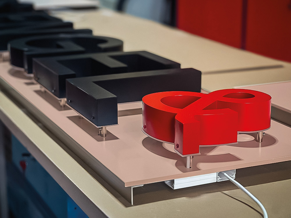 Die Werbeanlage wurde als LED-Profilbuchstabenanlage ausgeführt. Die einzelnen Buchstaben besitzen eine Versalhöhe von ca. 300 mm bei einer Bautiefe von rund 50 mm und wurden mit Abstand auf einer Grundplatte montiert. Diese Konstruktionsweise sorgt für eine klare Tiefenwirkung und eine saubere Trennung zwischen Schriftzug und Fassadenfläche.