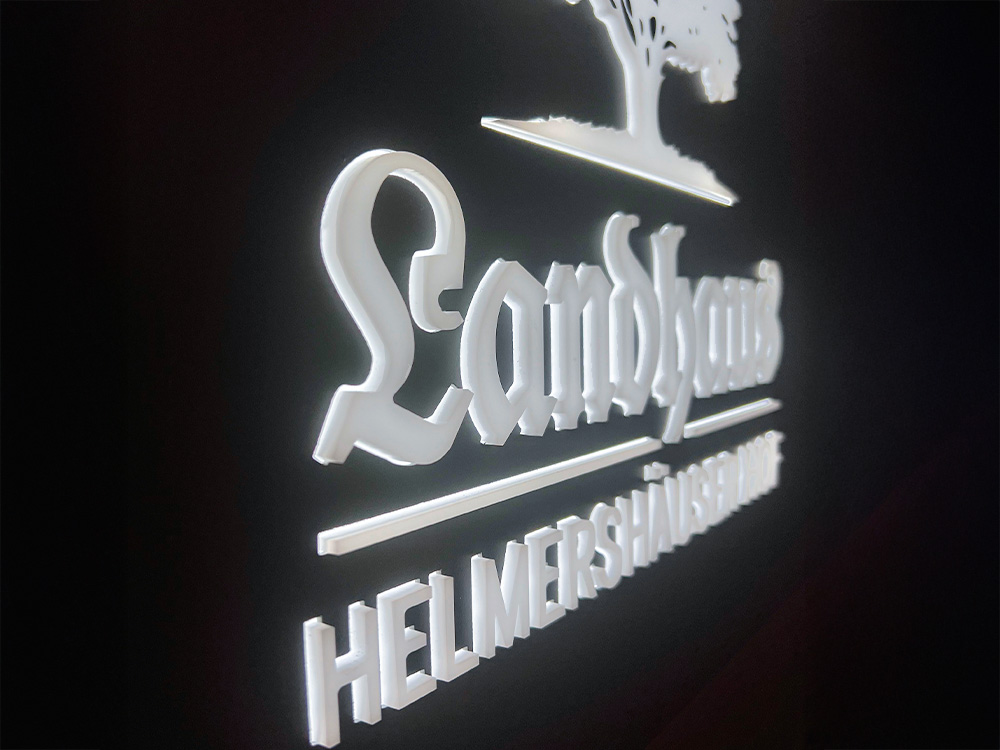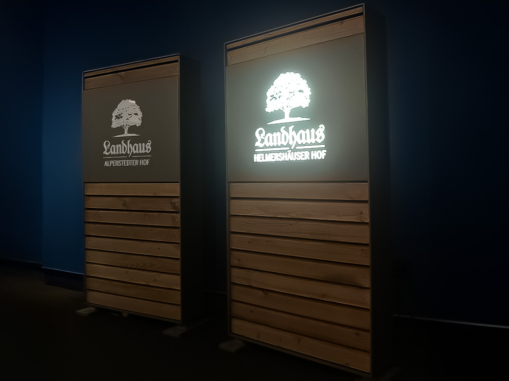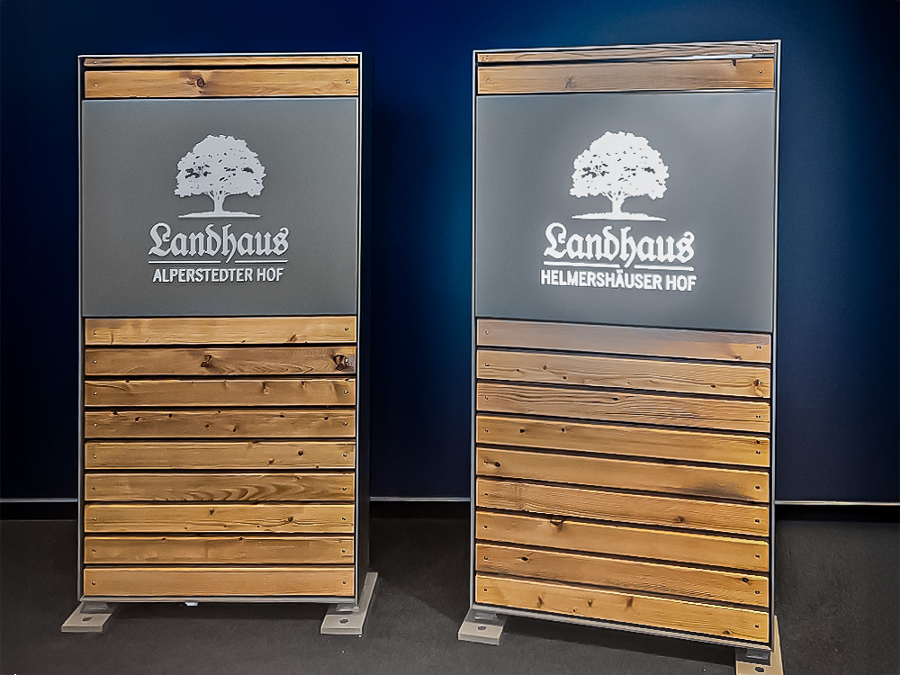 Jeder Werbepylon wurde von uns kombiniert mit einer stabile Stahlkonstruktion und mit einer Verkleidung aus Lärchenholzleisten, die für eine warme, natürliche Anmutung sorgt. Im Mittelpunkt steht das Landhaus-Logo, gefertigt aus weißem Acrylglas und dezent von innen heraus beleuchtet. So entsteht eine klare, ruhige Gestaltung, die tagsüber harmonisch wirkt und bei Dunkelheit eine angenehme Lichtwirkung entfaltet.