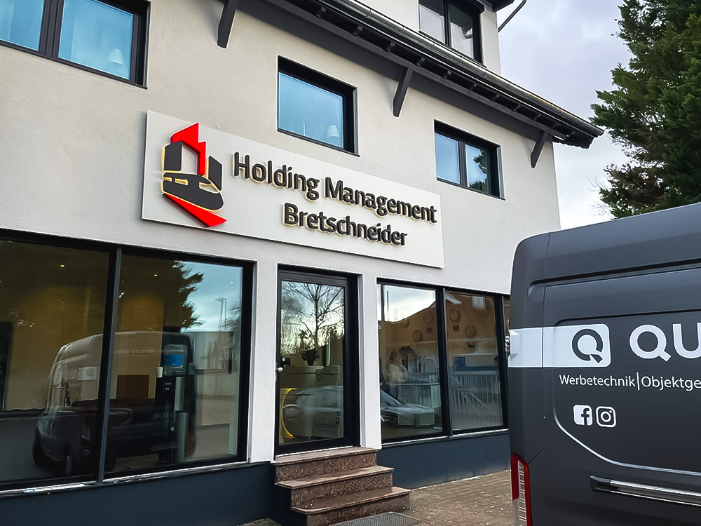 Für Holding Management Bretschneider haben wir eine großformatige, individuell gefertigte Werbeanlage an der Fassade realisiert. Ziel des Projekts war es, den Standort klar zu kennzeichnen und dem Gebäude eine eindeutige, professionelle Außenwirkung zu geben. Die Anlage wurde speziell für dieses Objekt geplant und in Proportion, Materialität und Position exakt auf die vorhandene Architektur abgestimmt.