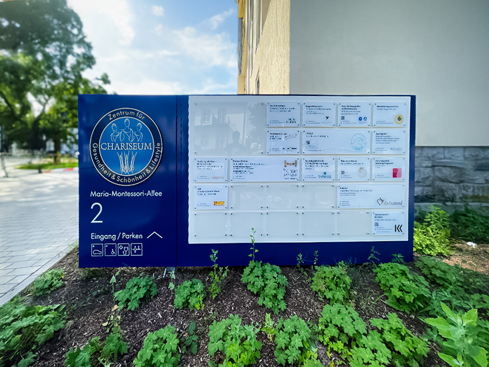 Für das CHARISEUM durften wir die bestehende Beschilderung konsequent weiterentwickeln und ergänzen. Bereits in einem vorherigen Projekt hatten wir sowohl einen Werbepylon im Außenbereich als auch ein internes Wegeleitsystem realisiert. Auf dieser Grundlage wurde das Leitsystem nun erweitert, um zusätzliche Orientierungspunkte im Innen- und Außenbereich zu schaffen.