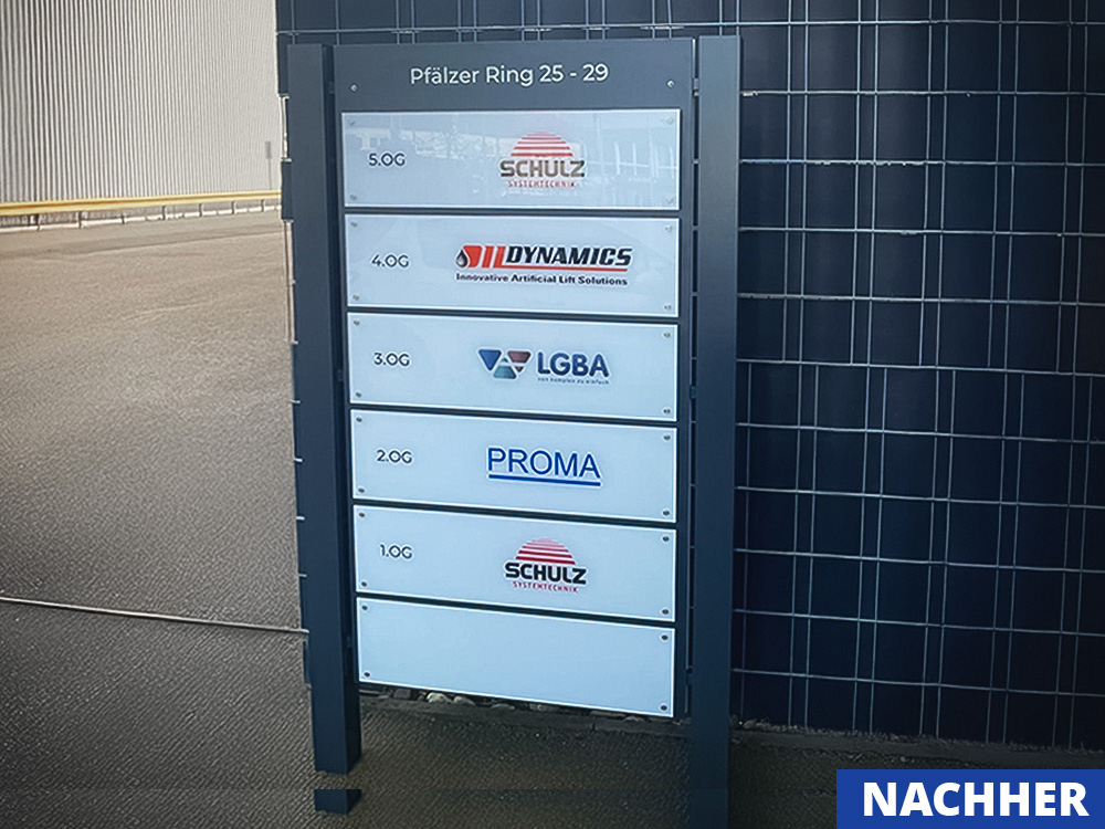 Jedes Schild zeigt das jeweilige Logo der Mieter in Kombination mit der entsprechenden Etage, wodurch eine klare Zuordnung und schnelle Orientierung vor Ort ermöglicht wird. Die Straßenbezeichnung wurde mittels Hochleistungsfolie umgesetzt und präzise in die Gesamtgestaltung integriert.