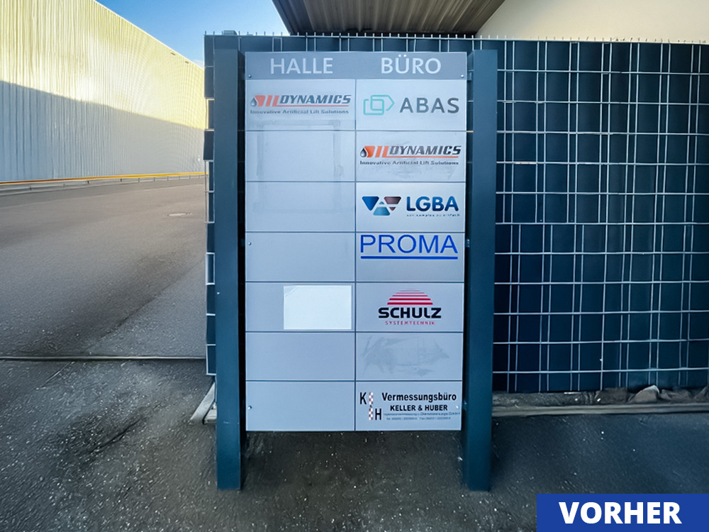 Im Zuge der Umrüstung wurden die bestehenden Flächen der Pylone vollständig überarbeitet. Die alten Schilder wurden durch neue, folierte HPL-Grundplatten ersetzt, die eine stabile und langlebige Basis für die Beschriftung bieten.